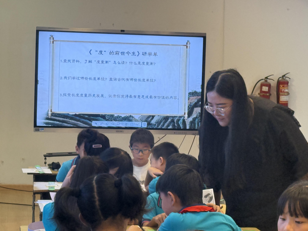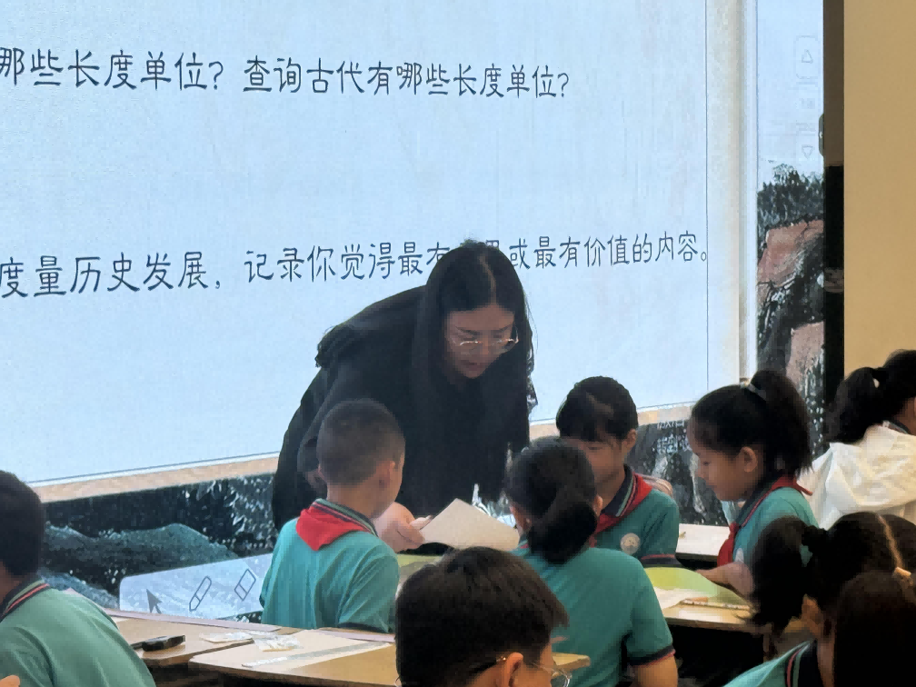 第二节课,颜悦老师以《“度”的前世今生》为主题,和四4班的学生共同开启一场知识与文化兼具的数学探索之旅。她创新设计“明线+暗线”双线教学结构:明线以“时间轴”为脉络,从远古“布指知寸、布手知尺”的身体度量,到秦朝“累黍成尺”的标准统一,再到近代《米制公约》的现代度量体系,清晰呈现长度单位的演变历程;暗线依托三次递进式测量实践——从“布手尺”测量的局限认知,到分组制作“黍米尺”体会统一标准的意义,再到现代标准尺的精准测量,让学生亲历“从多元到统一、从粗略到精细”的计量发展逻辑。整堂课既让学生理解度量本质、发展量感,更在感受中华两千多年计量史中厚植文化自信,凸显数学与历史、生活的深度联结。