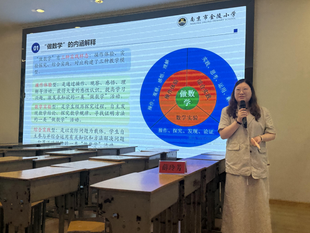 南京市金陵小学特级教师薛玲芳作《纵横联动·综合实践:构建做数学的结构化学习场域》专题讲座。她以前沿教育理论为支撑,结合工作室多年教学实践案例,深入剖析综合实践与结构化教学的核心逻辑:既强调知识体系的“纵向递进”,如从概念理解到规律探究的进阶,又注重学科与生活、跨学科内容的“横向联动”,如数学与历史、科学的融合,打破传统教学边界。讲座兼具理论高度与实践指导性,为教师搭建“做数学”教学的清晰框架,引发对结构化学习场域构建的深度思考。